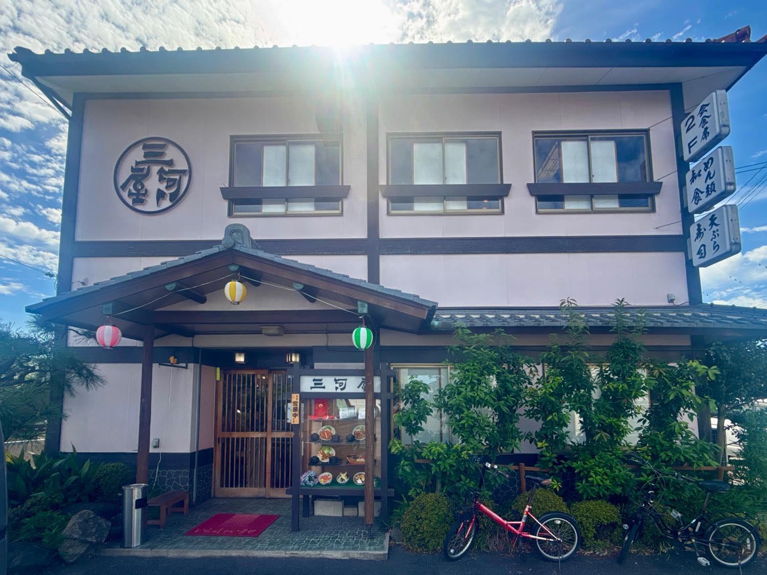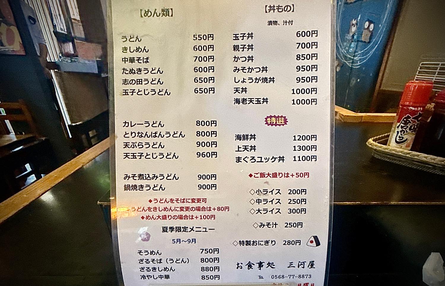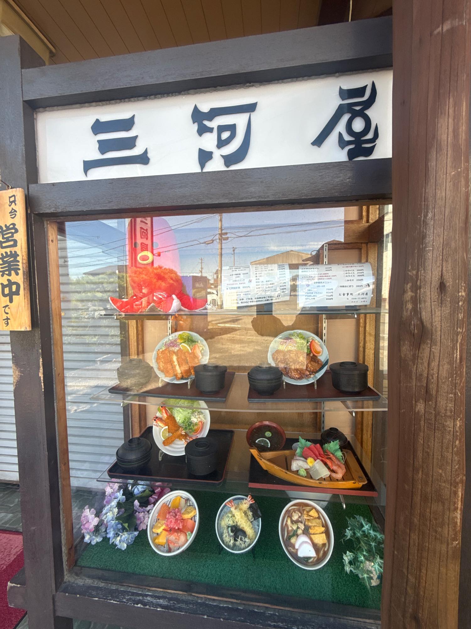 看板には「めん処」「和食」「天ぷら」「寿司」お食事処 三河屋さん