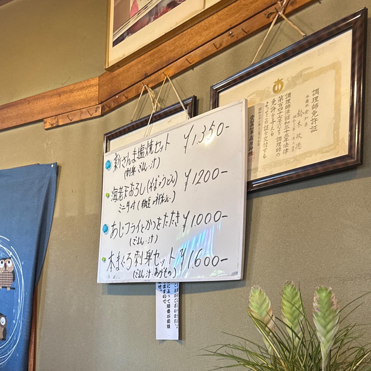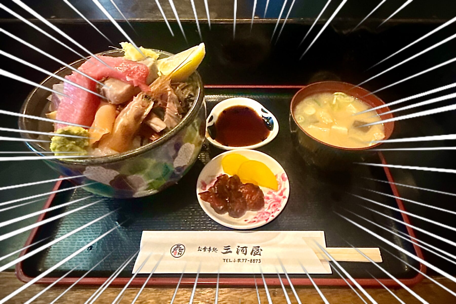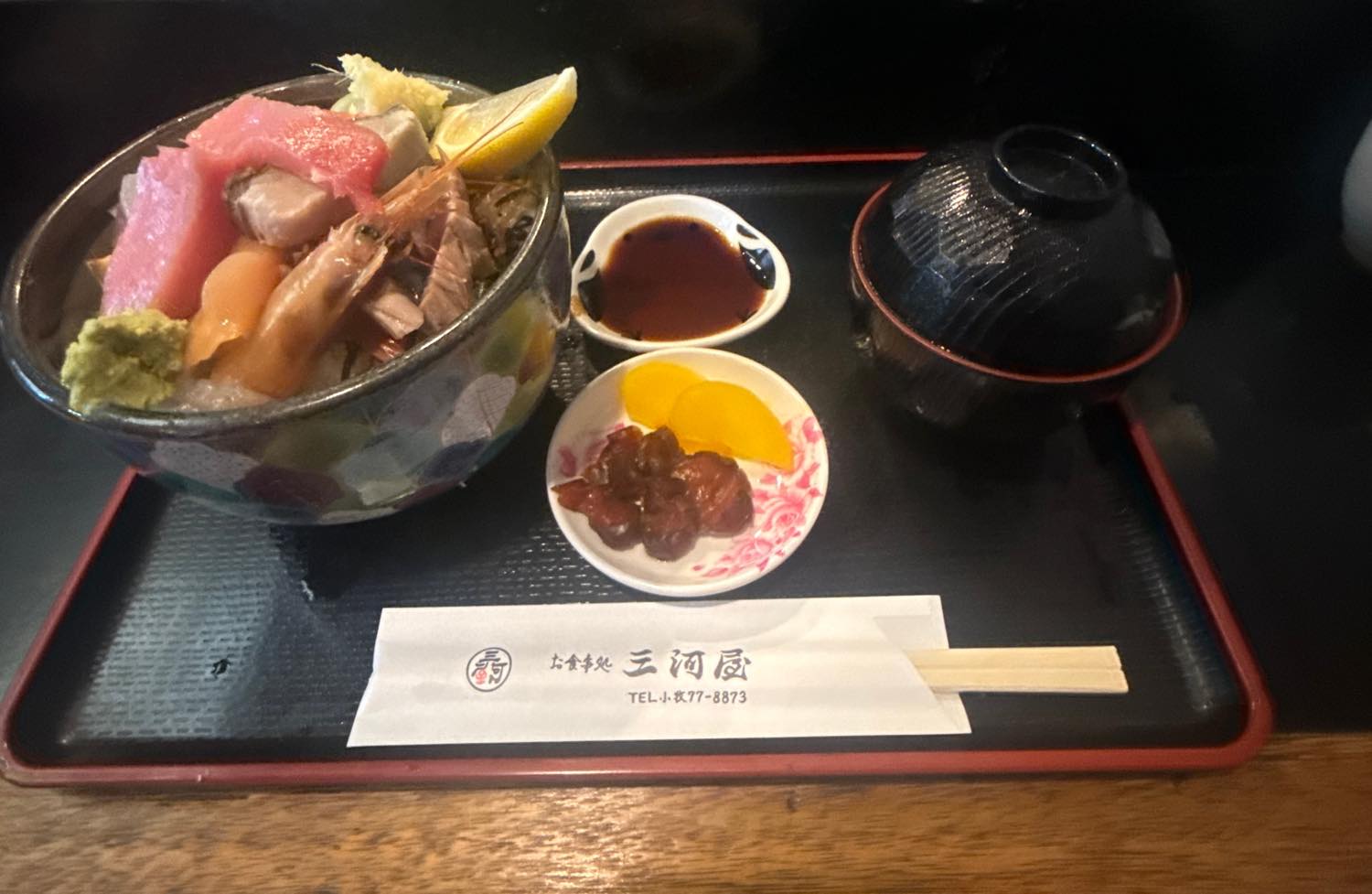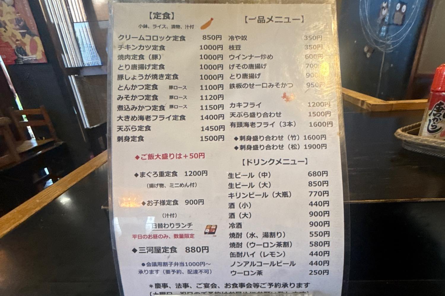 看板には「めん処」「和食」「天ぷら」「寿司」お食事処 三河屋さん