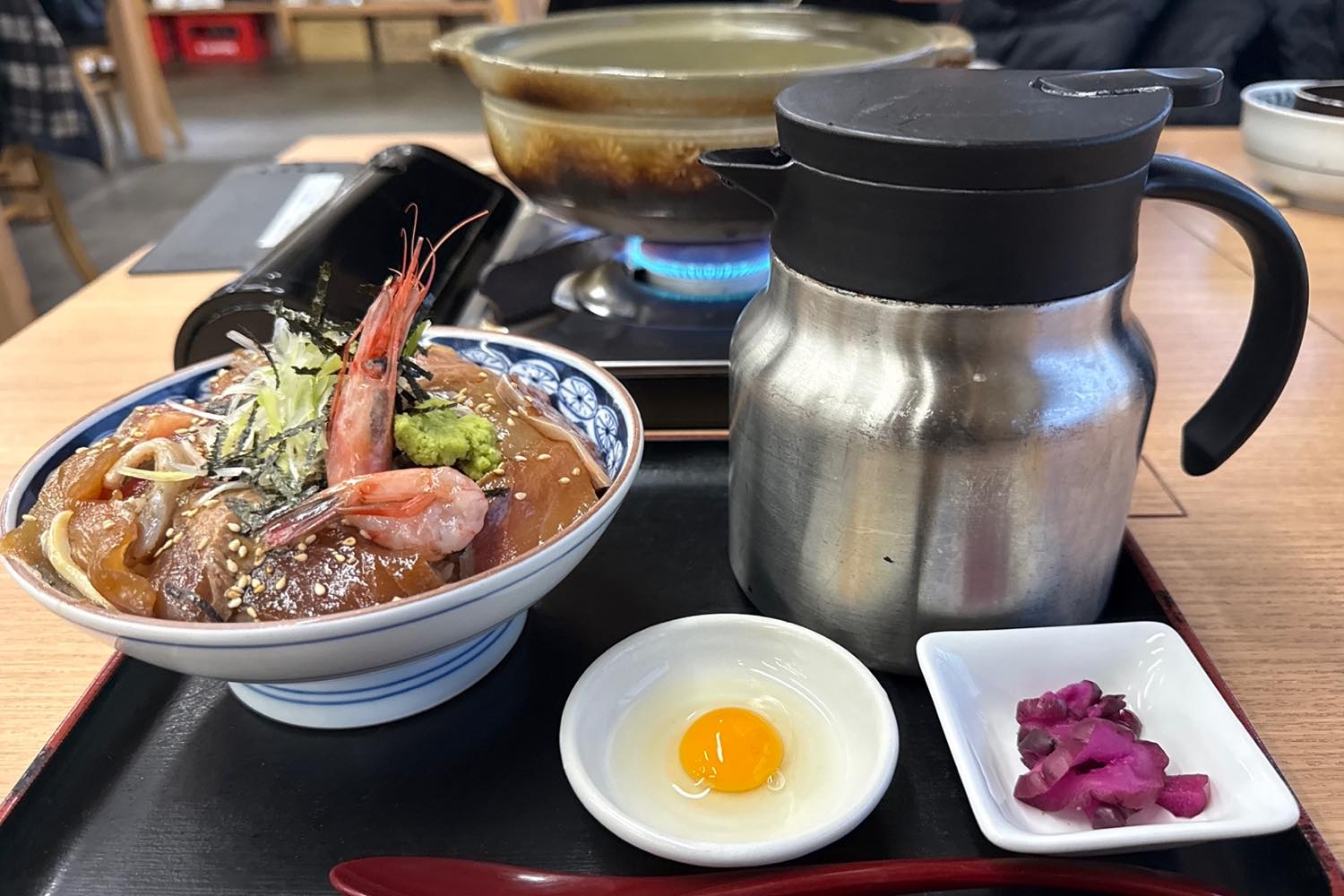 「海鮮漬丼定食(だし汁付)」2,080円。ポットに入っているのが出汁ですよ。